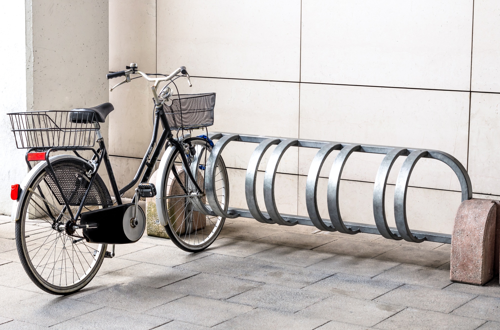 Bars to park bicycles, empty, installed at the entrance of a building.